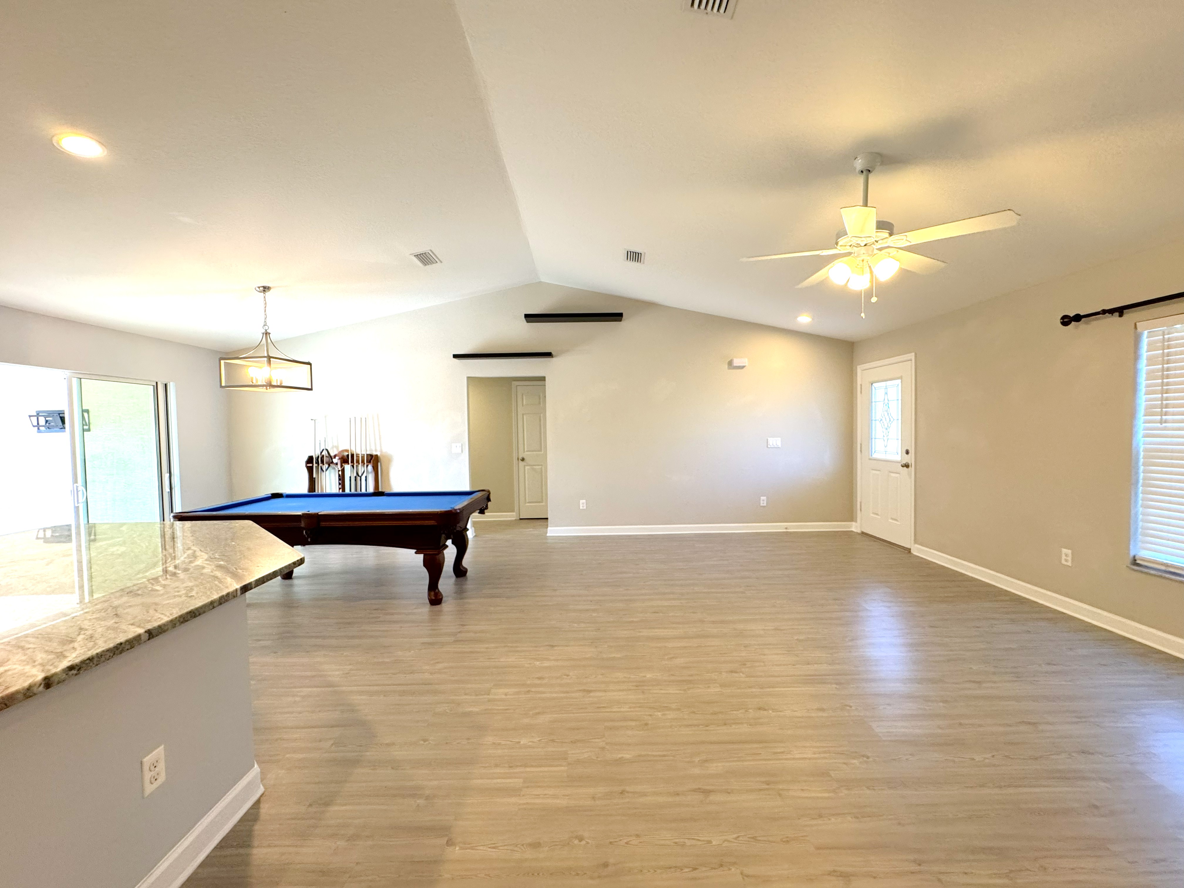 The primary bedroom includes an en-suite bathroom and direct access to the pool area. Additional highlights include a two-car garage, indoor laundry, and a spacious backyard. Conveniently located near parks, shopping, dining, and medical facilities, with easy access to Crystal River and the Gulf.